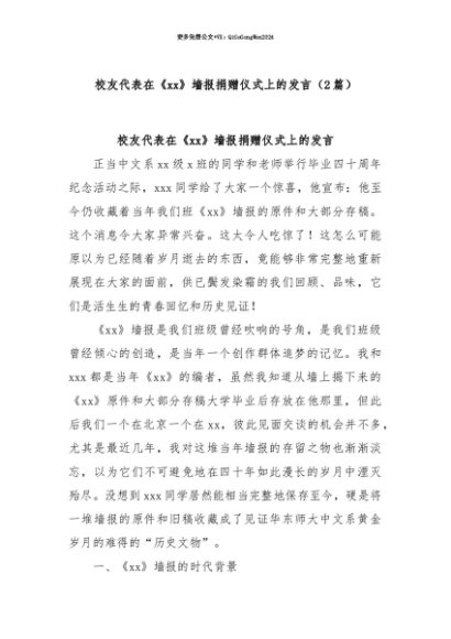 【七哥公文】2025年:【七哥公文】(2篇)校友代表在《xx》墙报捐赠仪式上的发言+更多免费公文+VX:QiGeGongWen2024+更多免费公文+VX:QiGeGongWen2024