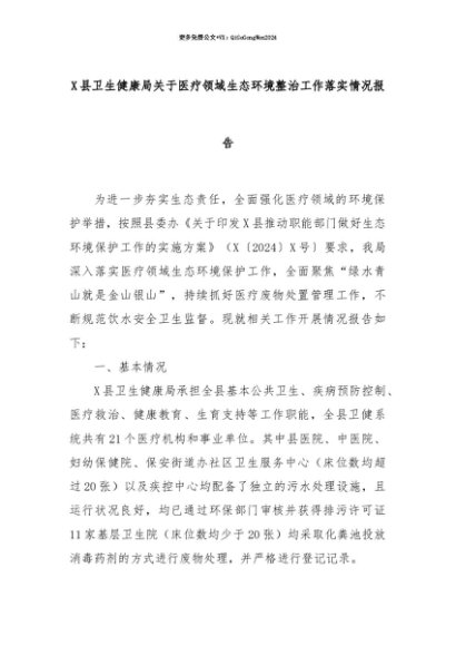 【七哥公文】2025年:【七哥公文】X县卫生健康局关于医疗领域生态环境整治工作落实情况报告+更多免费公文+VX:QiGeGongWen2024+更多免费公文+VX:QiGeGongWen2024
