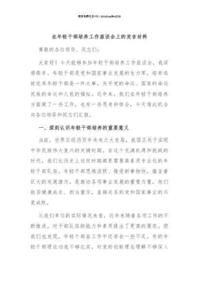 【七哥公文】2025年:【七哥公文】在年轻干部培养工作座谈会上的发言材料+更多免费公文+VX:QiGeGongWen2024+更多免费公文+VX:QiGeGongWen2024