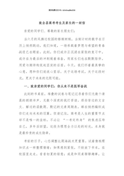 【七哥公文】2025年:【七哥公文】致全县高考考生及家长的一封信+更多免费公文+VX:QiGeGongWen2024+更多免费公文+VX:QiGeGongWen2024