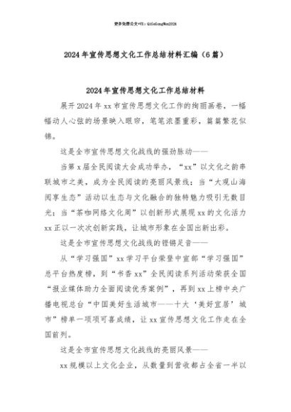 【七哥公文】2025年:【七哥公文】(6篇)2024年宣传思想文化工作总结材料汇编+更多免费公文+VX:QiGeGongWen2024+更多免费公文+VX:QiGeGongWen2024