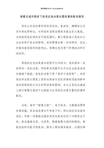【七哥公文】2025年:【七哥公文】智慧化城市视角下政府应急决策处置的重构路径探究+更多免费公文+VX:QiGeGongWen2024+更多免费公文+VX:QiGeGongWen2024