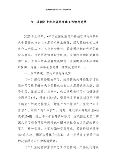 【七哥公文】2025年:【七哥公文】市工业园区上半年基层党建工作情况总结+更多免费公文+VX:QiGeGongWen2024+更多免费公文+VX:QiGeGongWen2024