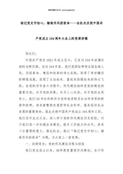 【七哥公文】2025年:【七哥公文】铭记党史守初心,锤炼作风担使命——在机关庆祝中国共产党成立104周年大会上的党课讲稿+更多免费公文+VX:QiGeGongWen2024+更多免费公文+VX:QiGeGongWen2024