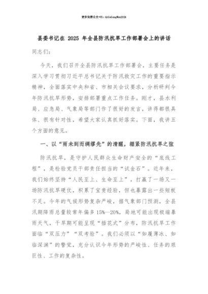 【七哥公文】2025年:【七哥公文】县委书记在 2025 年全县防汛抗旱工作部署会上的讲话+更多免费公文+VX:QiGeGongWen2024+更多免费公文+VX:QiGeGongWen2024