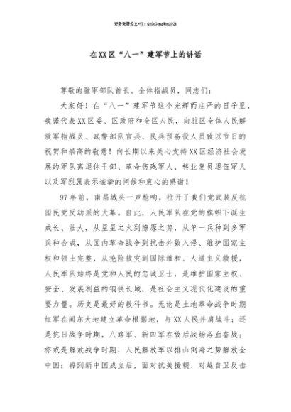 【七哥公文】2025年:【七哥公文】在XX区“八一”建军节上的讲话+更多免费公文+VX:QiGeGongWen2024+更多免费公文+VX:QiGeGongWen2024