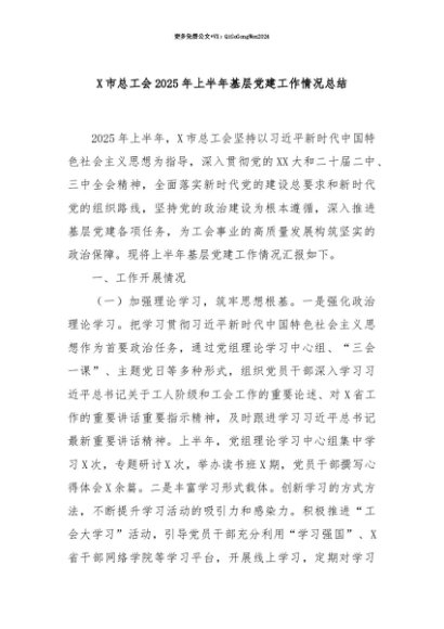 【七哥公文】2025年:【七哥公文】X市总工会2025年上半年基层党建工作情况总结+更多免费公文+VX:QiGeGongWen2024+更多免费公文+VX:QiGeGongWen2024