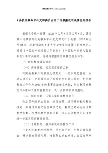 【七哥公文】2025年:【七哥公文】X县机关事务中心支部委员会关于巡察整改进展情况的报告+更多免费公文+VX:QiGeGongWen2024+更多免费公文+VX:QiGeGongWen2024