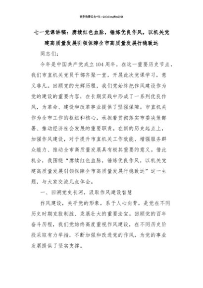 【七哥公文】2025年:【七哥公文】七一党课讲稿:赓续红色血脉,锤炼优良作风,以机关党建高质量发展引领保障全市高质量发展行稳致远+更多免费公文+VX:QiGeGongWen2024+更多免费公文+VX:QiGeGongWen2024