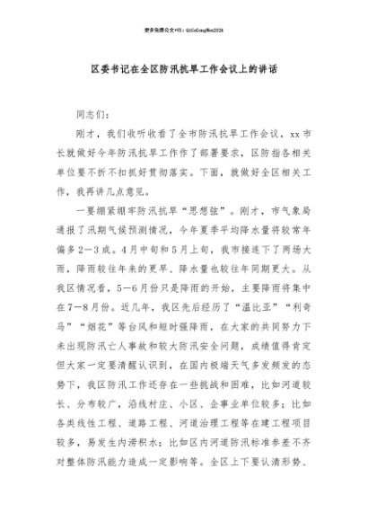 【七哥公文】2025年:【七哥公文】区委书记在全区防汛抗旱工作会议上的讲话+更多免费公文+VX:QiGeGongWen2024+更多免费公文+VX:QiGeGongWen2024