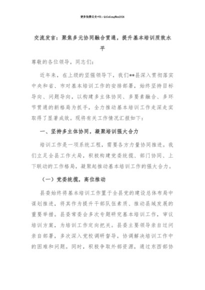 【七哥公文】2025年:【七哥公文】交流发言:聚焦多元协同融合贯通,提升基本培训质效水平+更多免费公文+VX:QiGeGongWen2024+更多免费公文+VX:QiGeGongWen2024