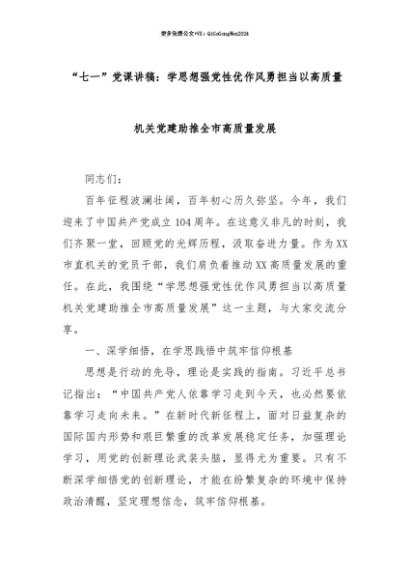 【七哥公文】2025年:【七哥公文】“七一”党课讲稿:学思想强党性优作风勇担当以高质量机关党建助推全市高质量发展+更多免费公文+VX:QiGeGongWen2024+更多免费公文+VX:QiGeGongWen2024