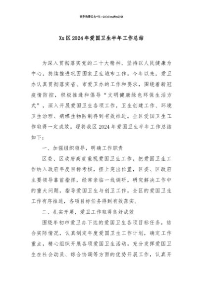 【七哥公文】2025年:【七哥公文】Xx区2024年爱国卫生半年工作总结+更多免费公文+VX:QiGeGongWen2024+更多免费公文+VX:QiGeGongWen2024