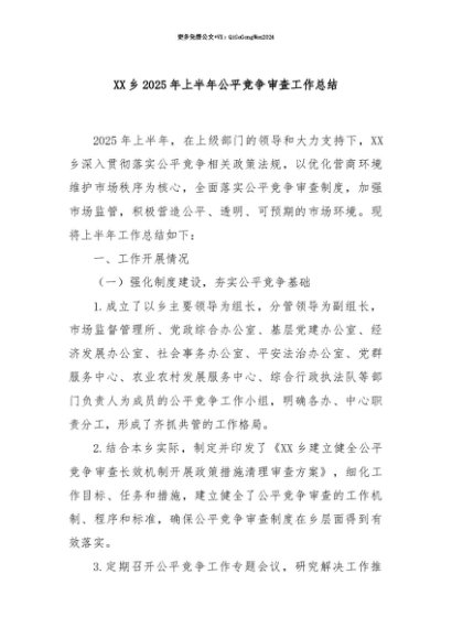 【七哥公文】2025年:【七哥公文】XX乡2025年上半年公平竞争审查工作总结+更多免费公文+VX:QiGeGongWen2024+更多免费公文+VX:QiGeGongWen2024