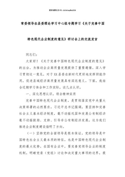 【七哥公文】2025年:【七哥公文】常委领导在县委理论学习中心组专题学习《关于完善中国特色现代企业制度的意见》研讨会上的交流发言+更多免费公文+VX:QiGeGongWen2024+更多免费公文+VX:QiGeGongWen2024