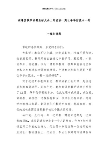 【七哥公文】2025年:【七哥公文】在课堂教学讲赛总结大会上的发言:莫让年华付流水一针一线织锦程+更多免费公文+VX:QiGeGongWen2024+更多免费公文+VX:QiGeGongWen2024
