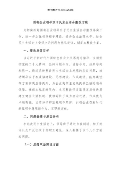 【七哥公文】2025年:【七哥公文】国有企业领导班子民主生活会整改方案+更多免费公文+VX:QiGeGongWen2024+更多免费公文+VX:QiGeGongWen2024