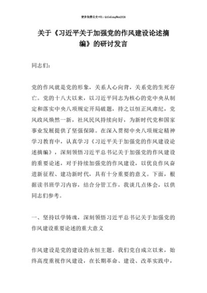 【七哥公文】2025年:【七哥公文】关于《习近平关于加强党的作风建设论述摘编》的研讨发言+更多免费公文+VX:QiGeGongWen2024+更多免费公文+VX:QiGeGongWen2024