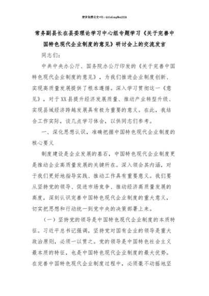 【七哥公文】2025年:【七哥公文】常务副县长在县委理论学习中心组专题学习《关于完善中国特色现代企业制度的意见》研讨会上的交流发言+更多免费公文+VX:QiGeGongWen2024+更多免费公文+VX:QiGeGongWen2024