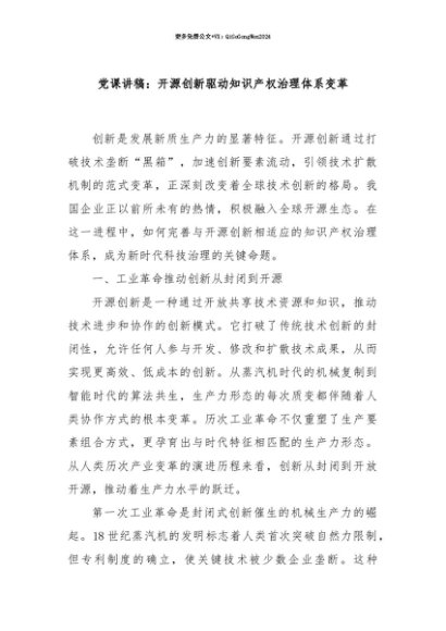 【七哥公文】2025年:【七哥公文】党课讲稿:开源创新驱动知识产权治理体系变革+更多免费公文+VX:QiGeGongWen2024+更多免费公文+VX:QiGeGongWen2024