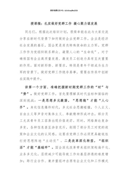 【七哥公文】2025年:【七哥公文】授课稿:扎实做好党群工作 凝心聚力谋发展+更多免费公文+VX:QiGeGongWen2024+更多免费公文+VX:QiGeGongWen2024