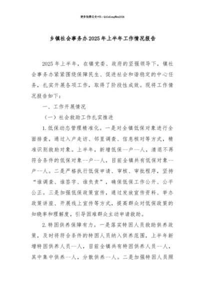 【七哥公文】2025年:【七哥公文】乡镇社会事务办2025年上半年工作情况报告+更多免费公文+VX:QiGeGongWen2024+更多免费公文+VX:QiGeGongWen2024