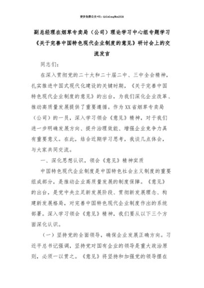 【七哥公文】2025年:【七哥公文】副总经理在烟草专卖局(公司)理论学习中心组专题学习《关于完善中国特色现代企业制度的意见》研讨会上的交流发言+更多免费公文+VX:QiGeGongWen2024+更多免费公文+VX:QiGeGongWen2024