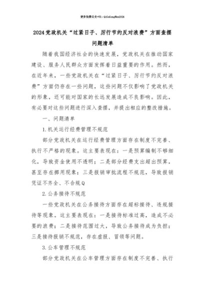 【七哥公文】2025年:【七哥公文】2024党政机关“过紧日子、厉行节约反对浪费”方面查摆问题清单+更多免费公文+VX:QiGeGongWen2024+更多免费公文+VX:QiGeGongWen2024