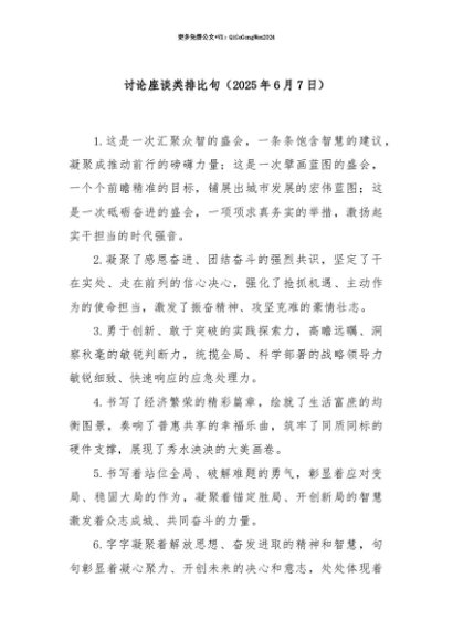 【七哥公文】2025年:【七哥公文】讨论座谈类排比句(2025年6月7日)+更多免费公文+VX:QiGeGongWen2024+更多免费公文+VX:QiGeGongWen2024