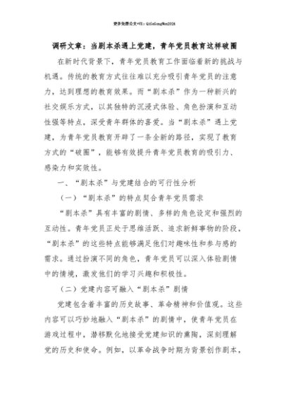 【七哥公文】2025年:【七哥公文】调研文章:当剧本杀遇上党建,青年党员教育这样破圈+更多免费公文+VX:QiGeGongWen2024+更多免费公文+VX:QiGeGongWen2024