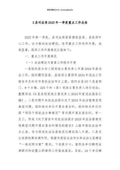 【七哥公文】2025年:【七哥公文】X县司法局2025年一季度重点工作总结+更多免费公文+VX:QiGeGongWen2024+更多免费公文+VX:QiGeGongWen2024