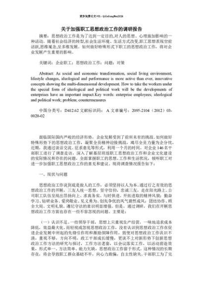 【七哥公文】2025年:【七哥公文】关于加强职工思想政治工作的调研报告+更多免费公文+VX:QiGeGongWen2024+更多免费公文+VX:QiGeGongWen2024