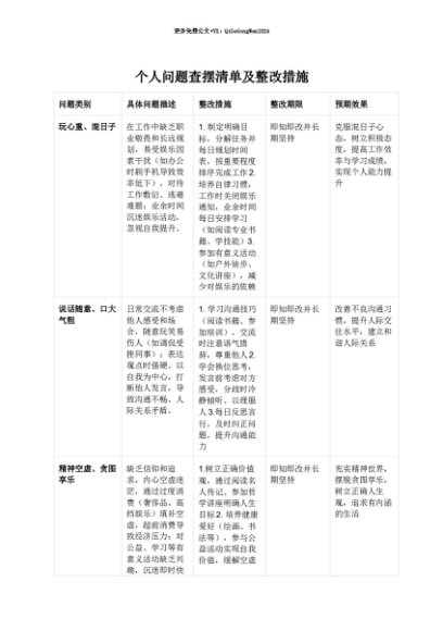【七哥公文】2025年:【七哥公文】个人问题查摆清单及整改措施(1)+更多免费公文+VX:QiGeGongWen2024+更多免费公文+VX:QiGeGongWen2024