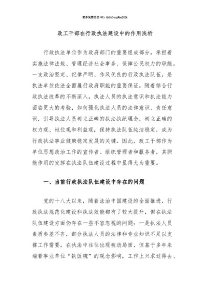 【七哥公文】2025年:【七哥公文】政工干部在行政执法建设中的作用浅析+更多免费公文+VX:QiGeGongWen2024+更多免费公文+VX:QiGeGongWen2024