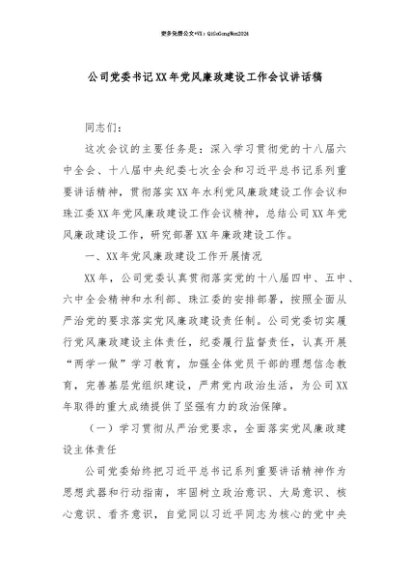 【七哥公文】2025年:【七哥公文】公司党委书记XX年党风廉政建设工作会议讲话稿+更多免费公文+VX:QiGeGongWen2024+更多免费公文+VX:QiGeGongWen2024