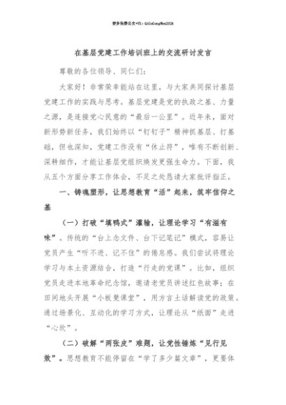 【七哥公文】2025年:【七哥公文】在基层党建工作培训班上的交流研讨发言+更多免费公文+VX:QiGeGongWen2024+更多免费公文+VX:QiGeGongWen2024