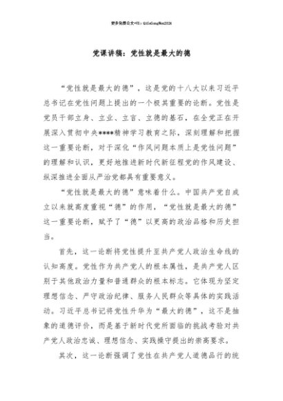【七哥公文】2025年:【七哥公文】党课讲稿:党性就是最大的德+更多免费公文+VX:QiGeGongWen2024+更多免费公文+VX:QiGeGongWen2024