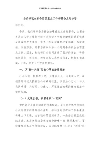 【七哥公文】2025年:【七哥公文】县委书记在社会治理重点工作部署会上的讲话+更多免费公文+VX:QiGeGongWen2024+更多免费公文+VX:QiGeGongWen2024