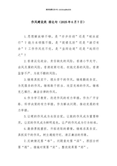【七哥公文】2025年:【七哥公文】作风建设类 排比句(2025年6月7日)+更多免费公文+VX:QiGeGongWen2024+更多免费公文+VX:QiGeGongWen2024
