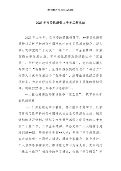 【七哥公文】2025年:【七哥公文】2025年市委组织部上半年工作总结+更多免费公文+VX:QiGeGongWen2024+更多免费公文+VX:QiGeGongWen2024