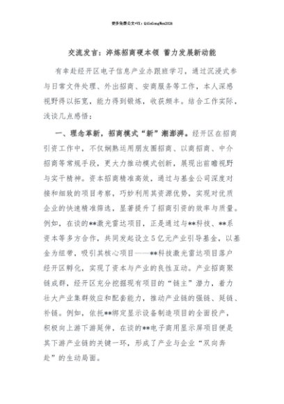 【七哥公文】2025年:【七哥公文】交流发言:淬炼招商硬本领 蓄力发展新动能+更多免费公文+VX:QiGeGongWen2024+更多免费公文+VX:QiGeGongWen2024