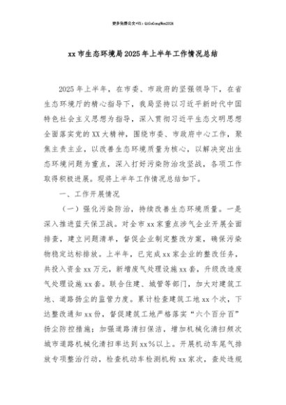 【七哥公文】2025年:【七哥公文】xx市生态环境局2025年上半年工作情况总结+更多免费公文+VX:QiGeGongWen2024+更多免费公文+VX:QiGeGongWen2024