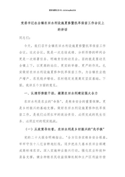 【七哥公文】2025年:【七哥公文】党委书记在全镇农田水利设施夏修暨抗旱保苗工作会议上的讲话+更多免费公文+VX:QiGeGongWen2024+更多免费公文+VX:QiGeGongWen2024