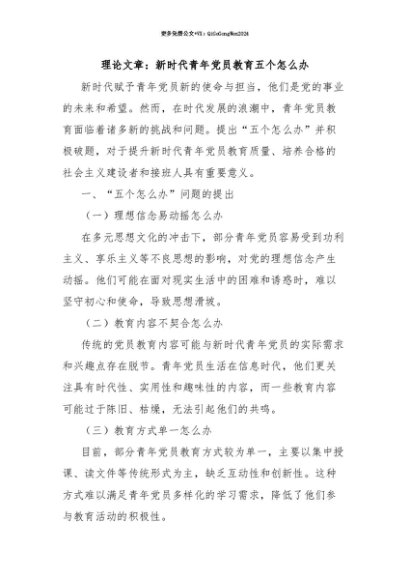 【七哥公文】2025年:【七哥公文】理论文章:新时代青年党员教育五个怎么办+更多免费公文+VX:QiGeGongWen2024+更多免费公文+VX:QiGeGongWen2024