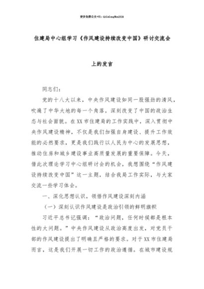 【七哥公文】2025年:【七哥公文】住建局中心组学习《作风建设持续改变中国》研讨交流会上的发言+更多免费公文+VX:QiGeGongWen2024+更多免费公文+VX:QiGeGongWen2024