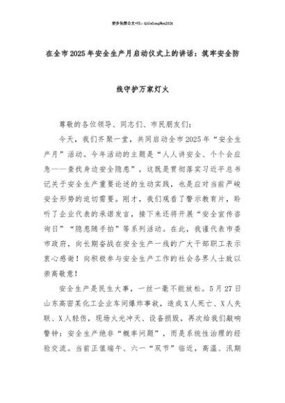 【七哥公文】2025年:【七哥公文】在全市2025年安全生产月启动仪式上的讲话:筑牢安全防线守护万家灯火+更多免费公文+VX:QiGeGongWen2024+更多免费公文+VX:QiGeGongWen2024