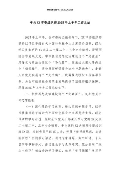 【七哥公文】2025年:【七哥公文】中共XX市委组织部2025年上半年工作总结+更多免费公文+VX:QiGeGongWen2024+更多免费公文+VX:QiGeGongWen2024