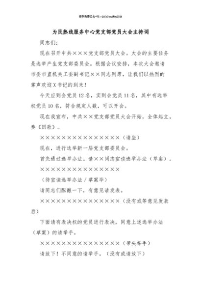 【七哥公文】2025年:【七哥公文】为民热线服务中心党支部党员大会主持词+更多免费公文+VX:QiGeGongWen2024+更多免费公文+VX:QiGeGongWen2024