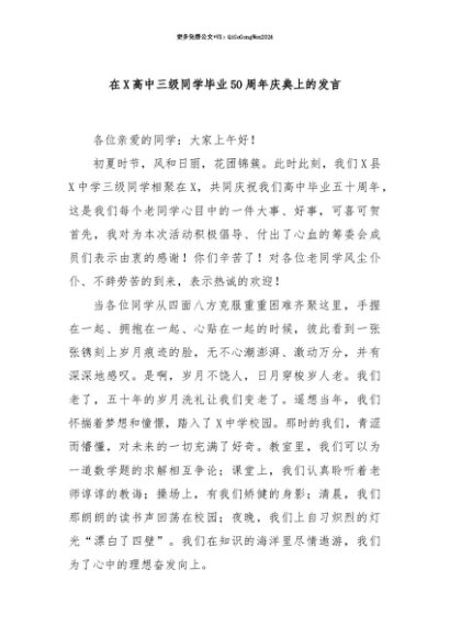 【七哥公文】2025年:【七哥公文】在X高中三级同学毕业50周年庆典上的发言+更多免费公文+VX:QiGeGongWen2024+更多免费公文+VX:QiGeGongWen2024