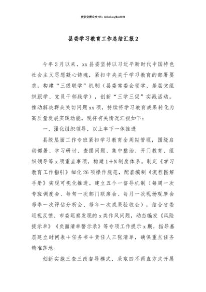 【七哥公文】2025年:【七哥公文】县委学习教育工作总结汇报2+更多免费公文+VX:QiGeGongWen2024+更多免费公文+VX:QiGeGongWen2024